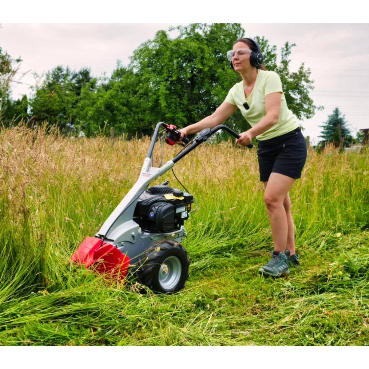 Briggs & Stratton motor od 2,3 kW i 150 ccm osigurava brz i ravnomjeran rad noževa pričvršćenih na strižnoj kosi – te uz pomoć pužnog prijenosnika pokreće pogon kotača koji se može uključiti ili isključiti (1 stupanj za vožnju unaprijed). U kombinaciji s rukohvatom s mogućnošću podešavanja visine i prigušenjem vibracija za savršeno vođenje uređaja i 13″ velikim, zrakom punjenim širokim gumama s farmerskim profilom omogućava se optimalno rukovanje na svakom terenu i na padinama s nagibom do cca. 20°.