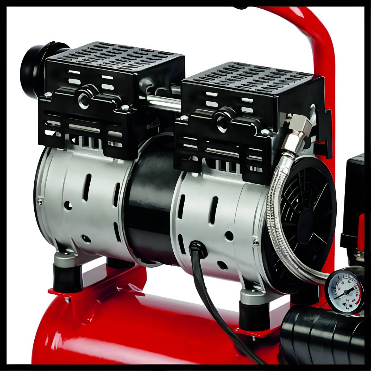 Einhell kompresor TE-AC 6 Silent višenamjenski je dio osnovne opreme koji je sada stigao u garažu i radionicu. Jedna od izvanrednih značajki ovog kompresora je to što stvara manje buke – tihi kompresor s nazivnom snagom od 550 W, tako da nema kompromisa ni u snazi. 57 dB (vrijednost LpA) ovog kompresora čini ga daleko tišim od standardnih kompresora s usporedivim performansama, a ima pumpu bez ulja i servisa koja zahtijeva samo malo održavanja. Odvodni vijak na kompresoru omogućuje jednostavno održavanje. Mobilni kompresor ima spremnik kompresora od 6 litara – tako da, koristeći prave alate uz njega, ima mnogo rezervi za nanošenje boje i laka u tren oka, ili za nanošenje ulja za zaštitu na drvo, selektivno ili preko velike površine područje. Također možete obavljati poslove čišćenja ili pjeskarenja u radionici. Ovaj svestrani pomoćnik bez napora pumpa gume za automobile, motocikle i bicikle, kao i lopte i zračne madrace. Einhell je uvjeren u kvalitetu i nudi desetogodišnje jamstvo protiv korozije spremnika. Postoji reduktor tlaka za regulaciju brojnih aplikacija do 8 bara. Uključeni su manometar i brzootpuštajuća spojka za kontrolirani radni tlak. Sigurnosni ventil štiti korisnika. Mala težina proizvoda i praktična ručka omogućuju mobilnost – samo nekoliko koraka i kompresor je spreman za lak transport, dok stabilnost tijekom korištenja osiguravaju noge koje apsorbiraju vibracije.