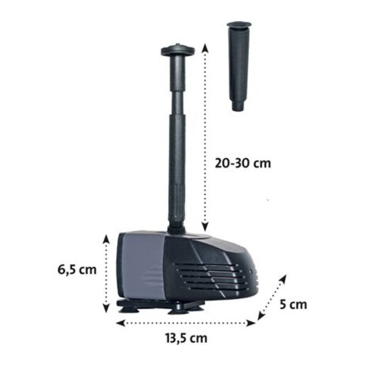 Heissner Smartline Jet Eco 600 (600 l / h (0,00017 m³ / s, 8 vata) s izlazom od 600 l / h ekonomična je pumpa za fontane za početnike. Crpka se isporučuje s opsežnim priborom i idealna je za vodene zdjele, zdjele za ribnjake, figure za jezerce, mini izvorsko kamenje ili unutarnje fontane. Isporuka uključuje teleskopsku šipku podesivu između 20 i 48 cm s dva nastavka za vodu za zvono i kaskadu. Crpka također ima priključak za jezerce. otporan je na mraz i može se koristiti pri zimskim temperaturama u jezercu do -20 ° C.