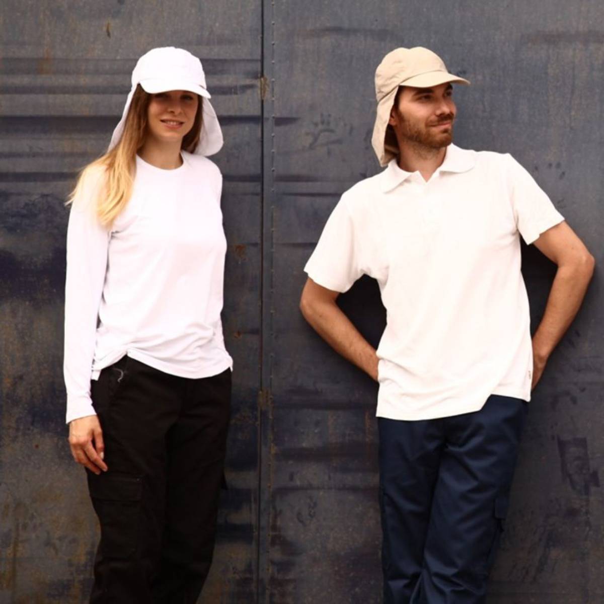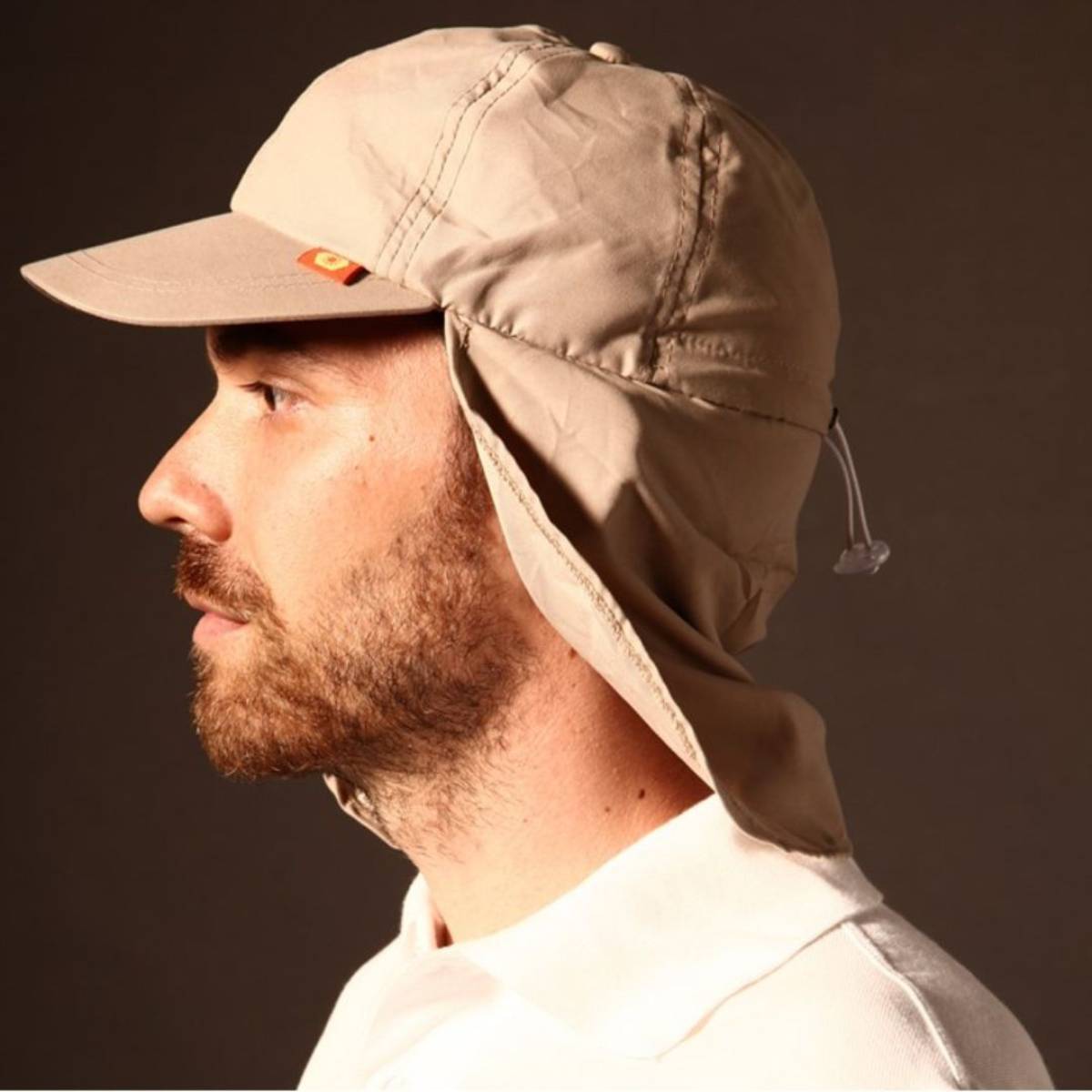Bež UV BROKULA CAREWEAR unisex šilit kapa s plaštom za zaštitu vrata. 100% reciklirana poliester mikrofibra s UV zaštitom i efektom hlađenja kože. UV BROKULA CAREWEAR šilt kapa u skladu je sa Standardom EN13758-2