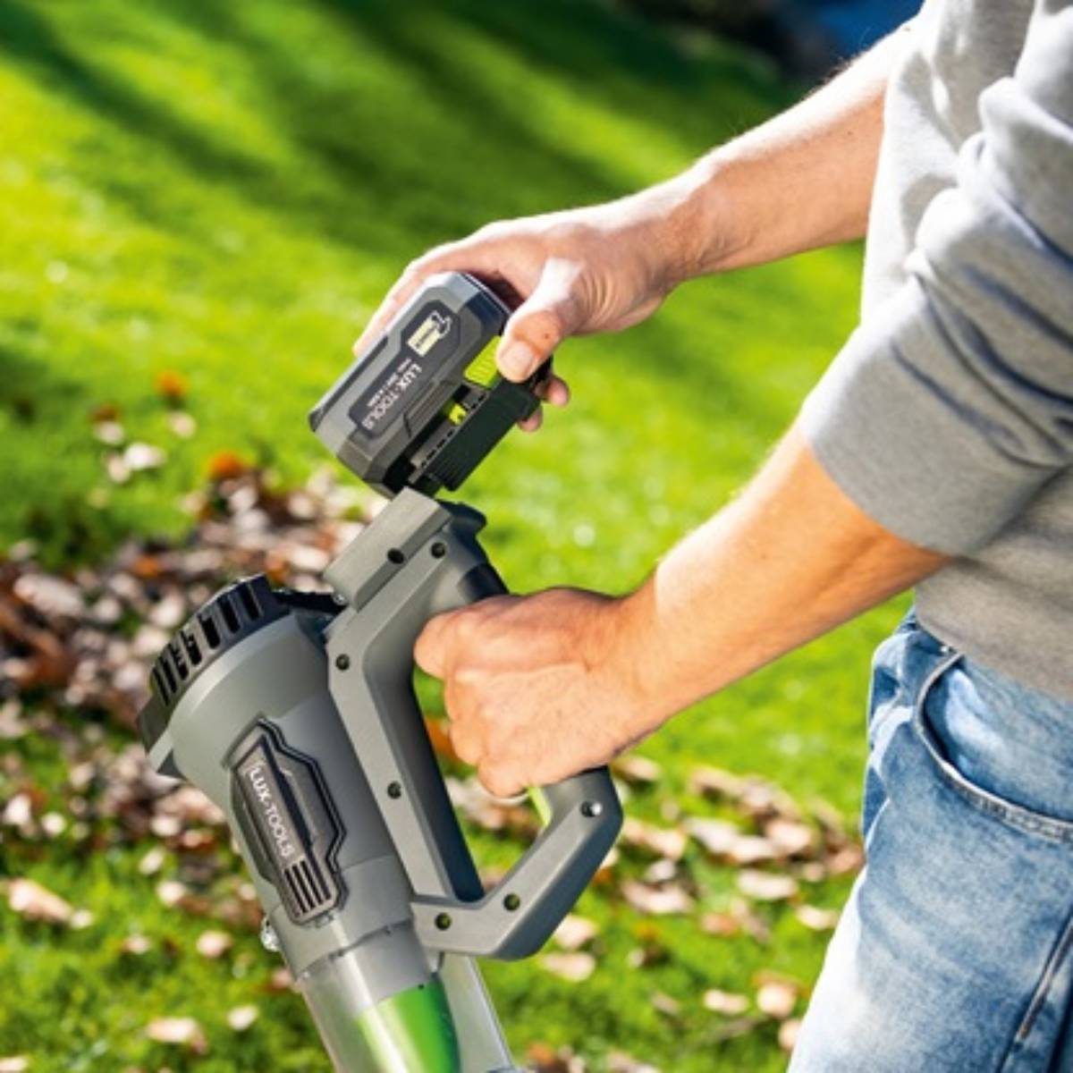 Puhalo za lišće na baterije dio je LUX 1 PowerSystem-a i može raditi sa litijum-jonskom baterijom od 20 V (18 V nominalno) koja pripada ovoj seriji i ima kapacitet od preko 2 Ah. Baterija i odgovarajući brzi punjač dostupni su zasebno i nisu uključeni u obim isporuke.