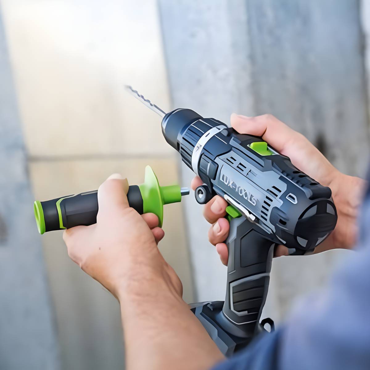 LUX-TOOLS akumulatorska udarna bušilica A-BS-20 / S impresionira sa tri funkcije: zavrtanje, bušenje i bušenje čekićem.