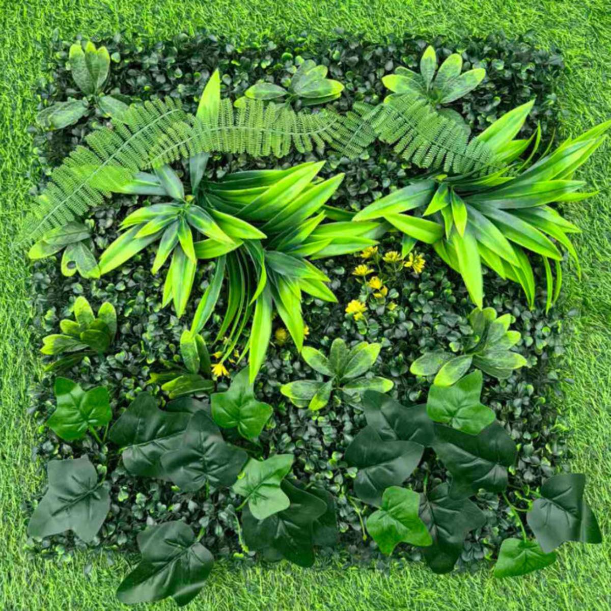 Pretvorite svaki zid u tropsku oazu uz umjetno dekorativno zelenilo AURELIA dimenzija 50x50cm. Bogat spoj različitih vrsta zelenih listova, paprati i suptilnih žutih cvjetova daje efekt bujne prirode i egzotične svježine. Ovaj realističan zidni panel ne zahtijeva održavanje, a izgleda spektakularno u svim uslovima – unutra ili vani.